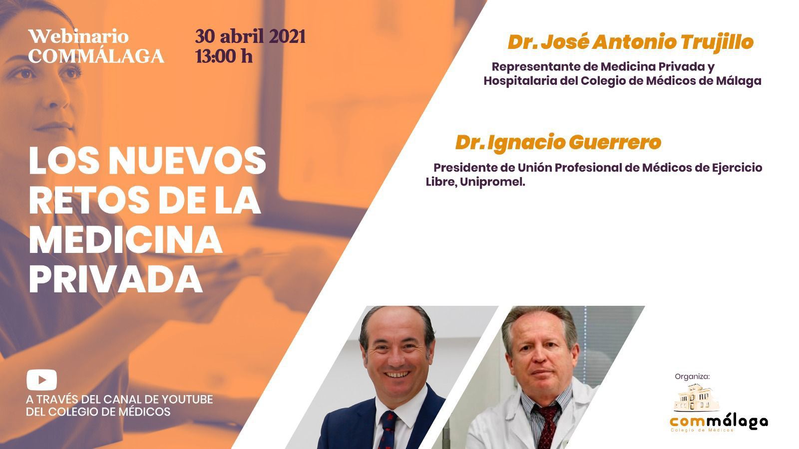 El viernes 30 de abril, el Colegio de Médicos de Málaga convoca el webinar sobre «Los nuevos retos de la medicina privada». Será a las 13.00 h. a través del canal de YouTube del COMM. Intervienen el Dr. José Antonio Trujillo, vocal de Medicina Privada y Hospitalaria del COMM y el Dr. Ignacio Guerrero, presidente de Unipromel.